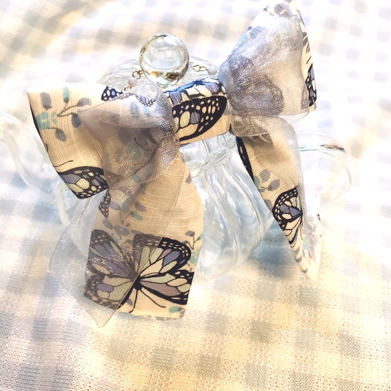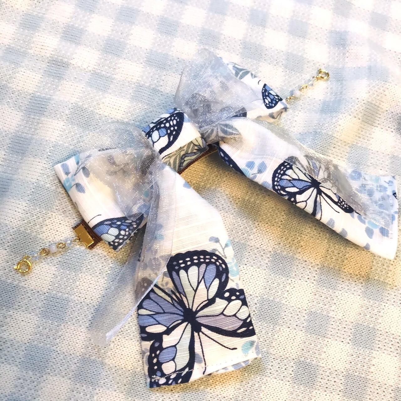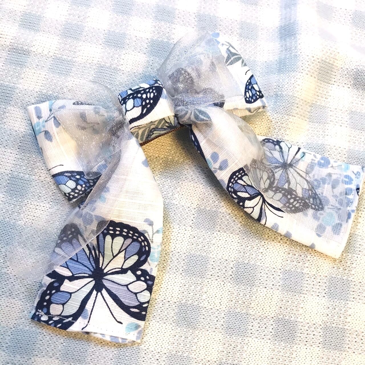 This ribbon is made of white and blue butterfly pattern Japanese pattern fabric overlaid with organdy silver-gray.The transparency of the organdy is a feature.