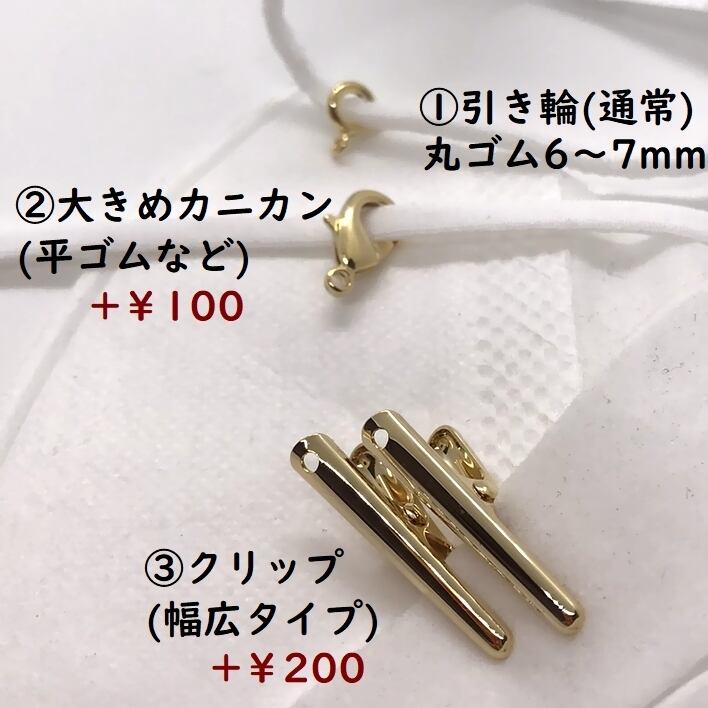 マスクゴムが耳の後ろに当たって痛い方のため、マスクゴムが耳に当たらないように引っ張るためのチェーンが左右に1つずつ付いています。