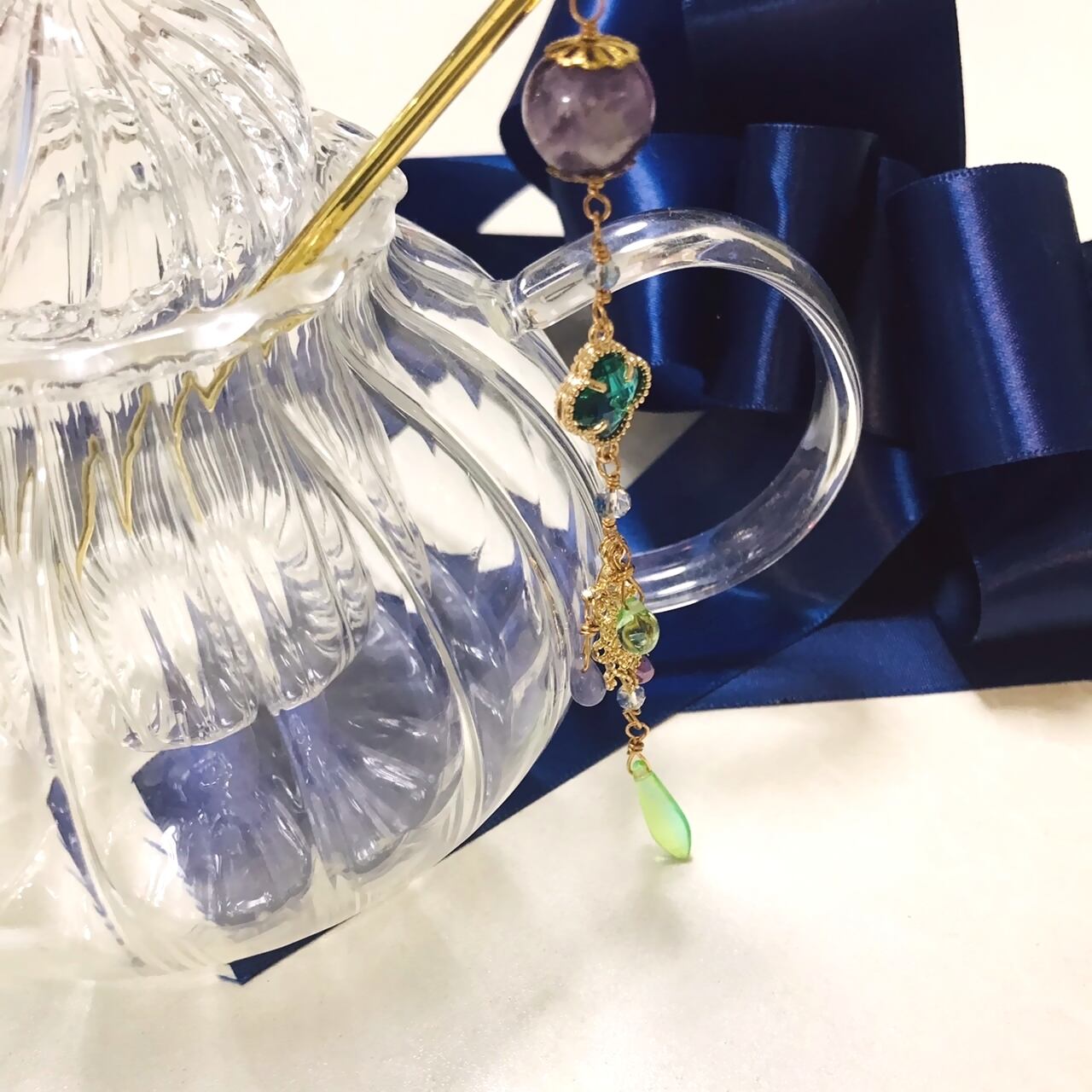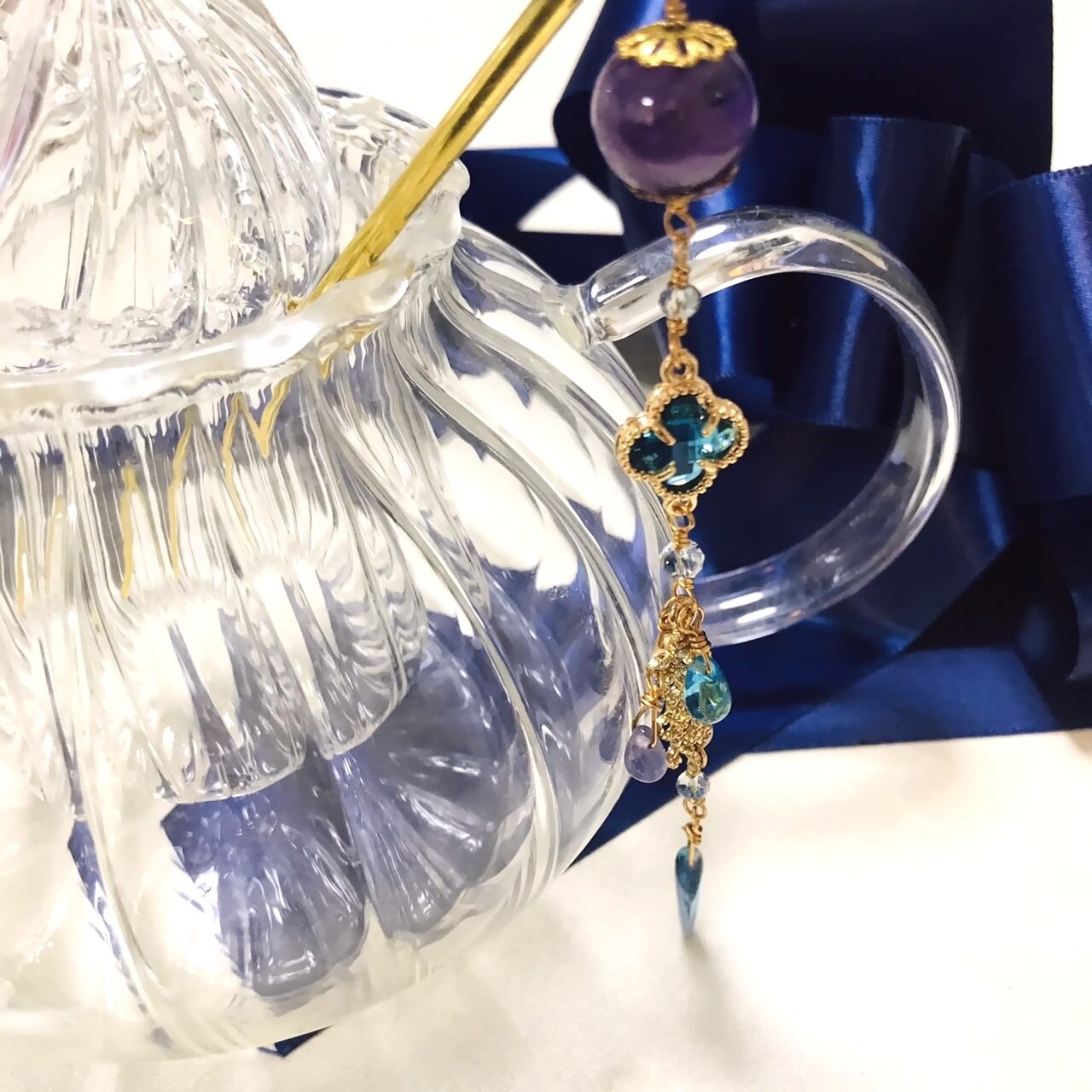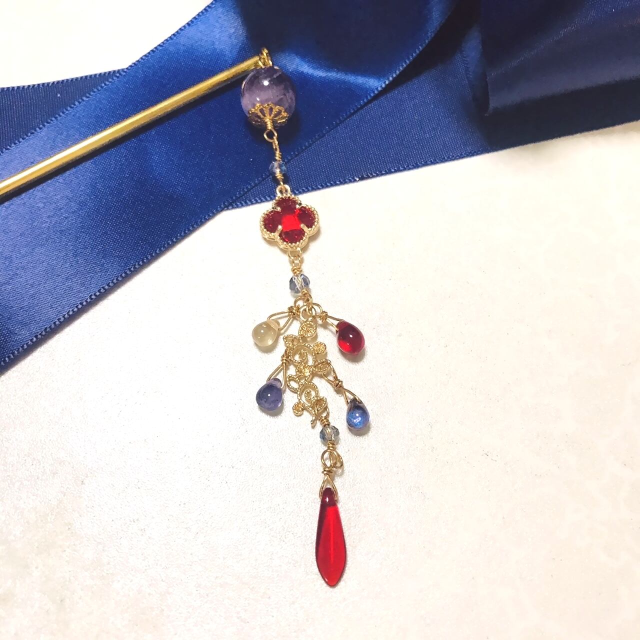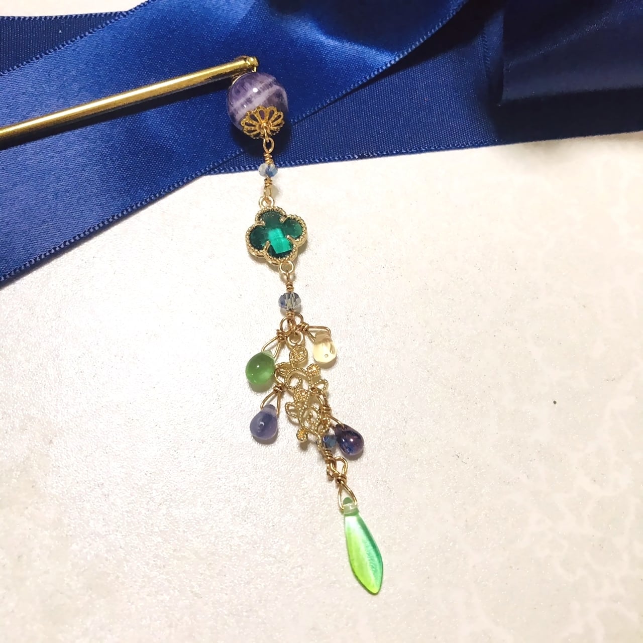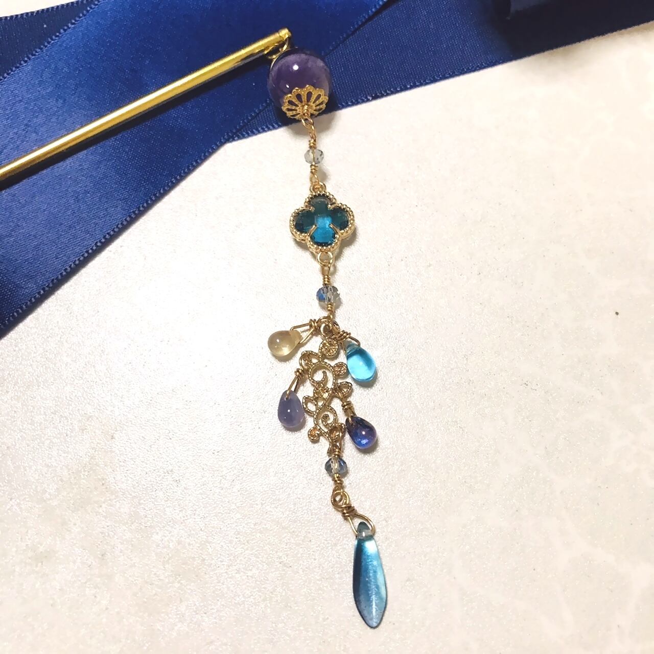 This is made of Moroccan tiles, glass parts that look like four-leaf clovers, glass beads, etc. The design is mature, but very glittering. This hair accessory is extremely sparkling and glamorous.
