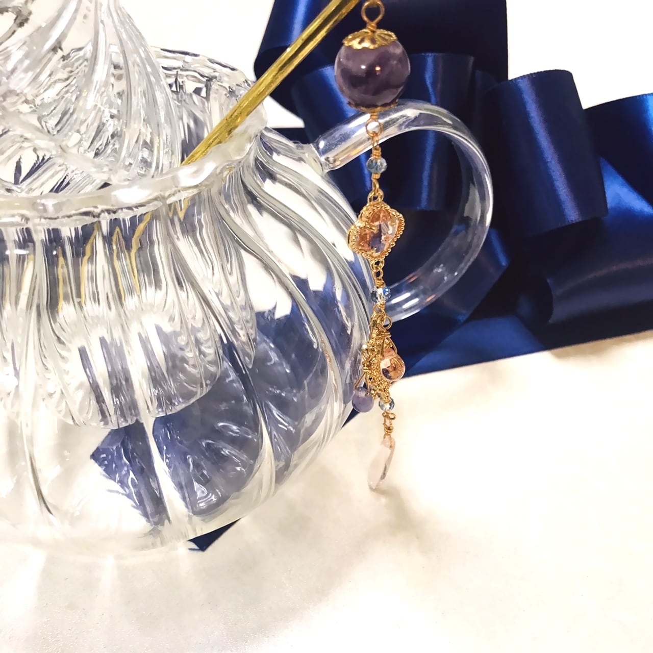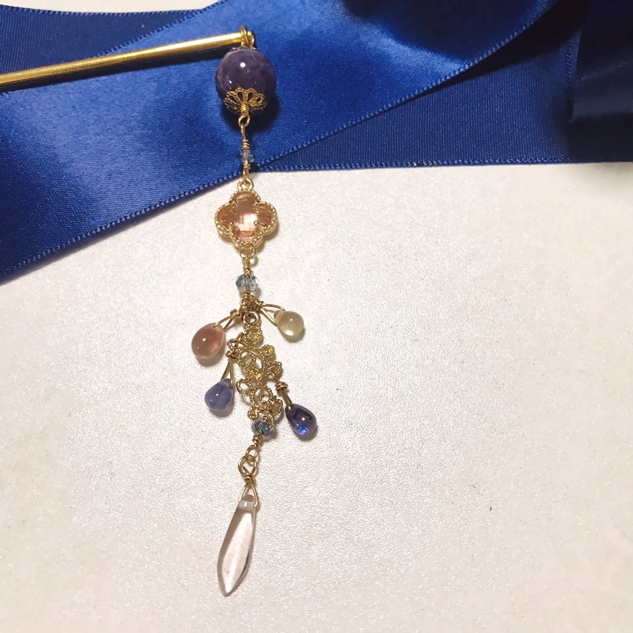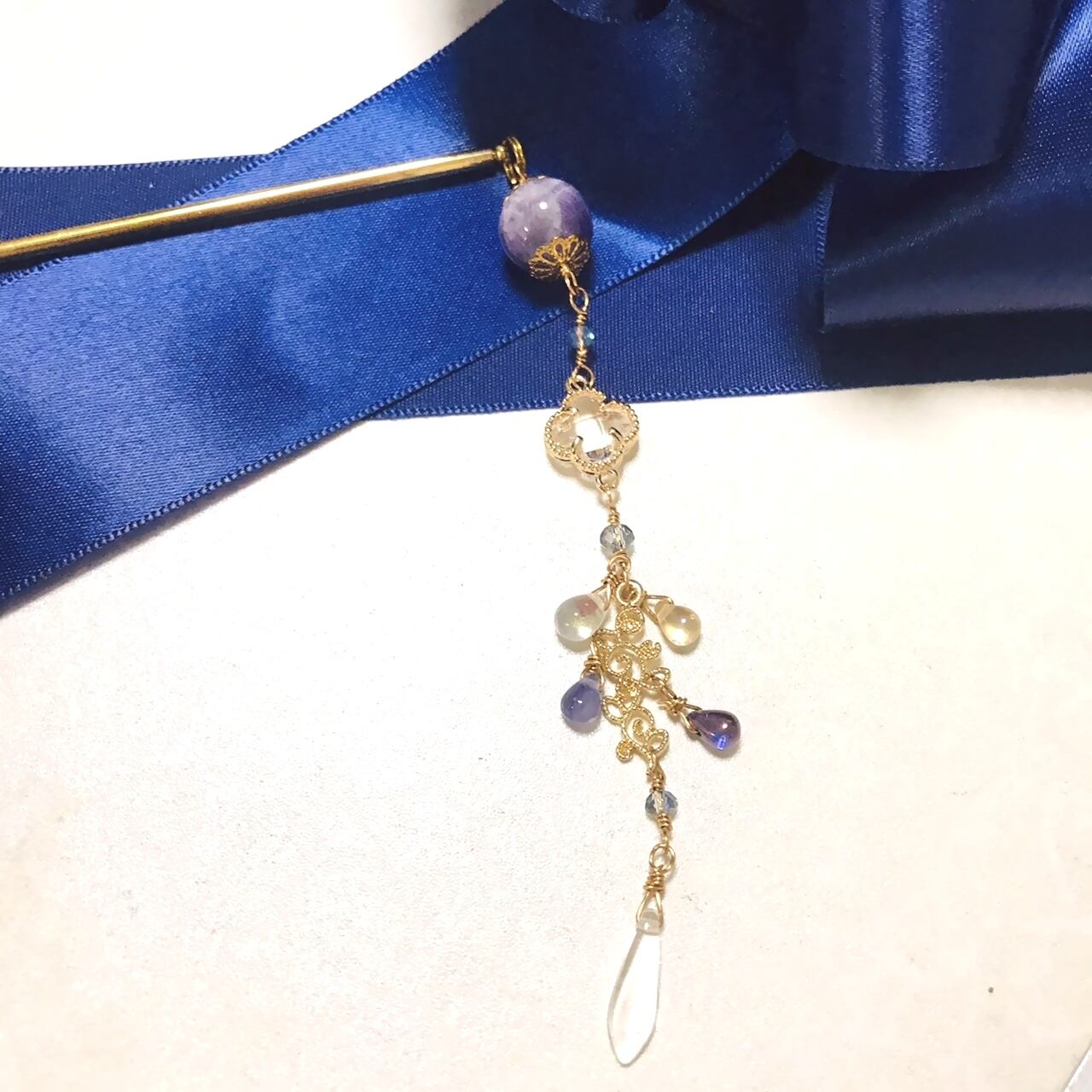 ケープアメジストという、アメジストとミルキークォーツが混ざった石をトップに配置した簪です。