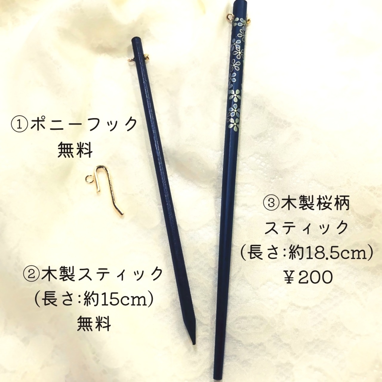 かんざしの軸(スティック)を、木製やポニーフック、二又かんざし等に変更可能です。