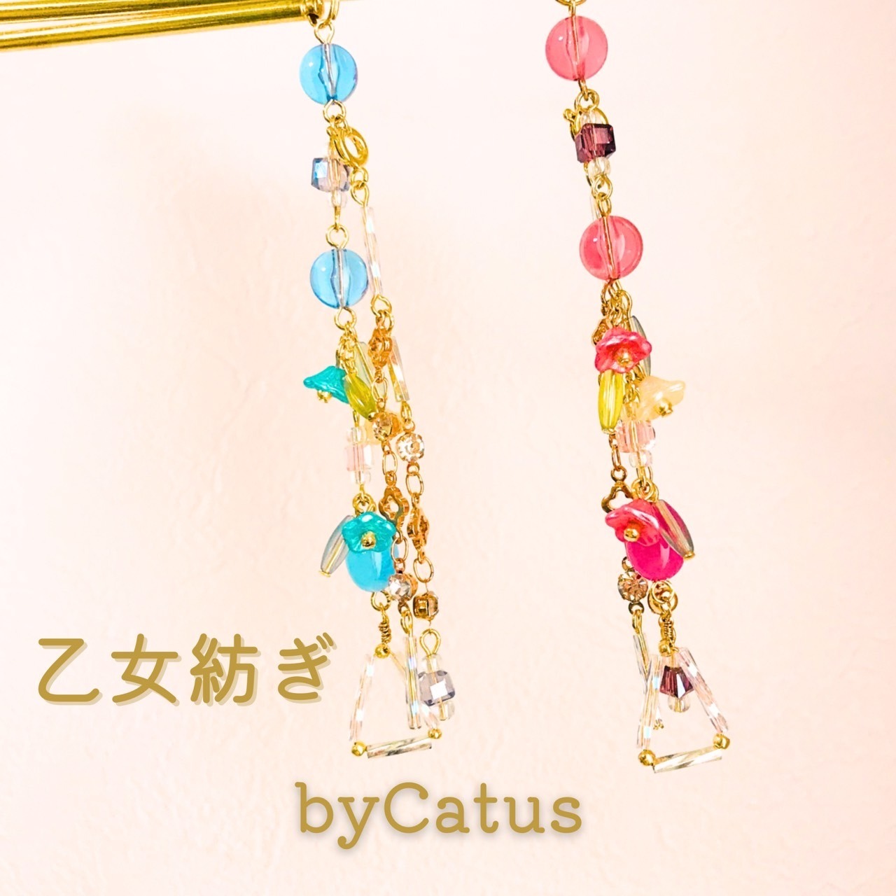 ベルフラワー(別名:オトメキキョウ)をモチーフにしたお花パーツを中心に、様々なビーズやチェーン等を用いて複雑に紡ぎ仕上げた、洋風かんざしです。