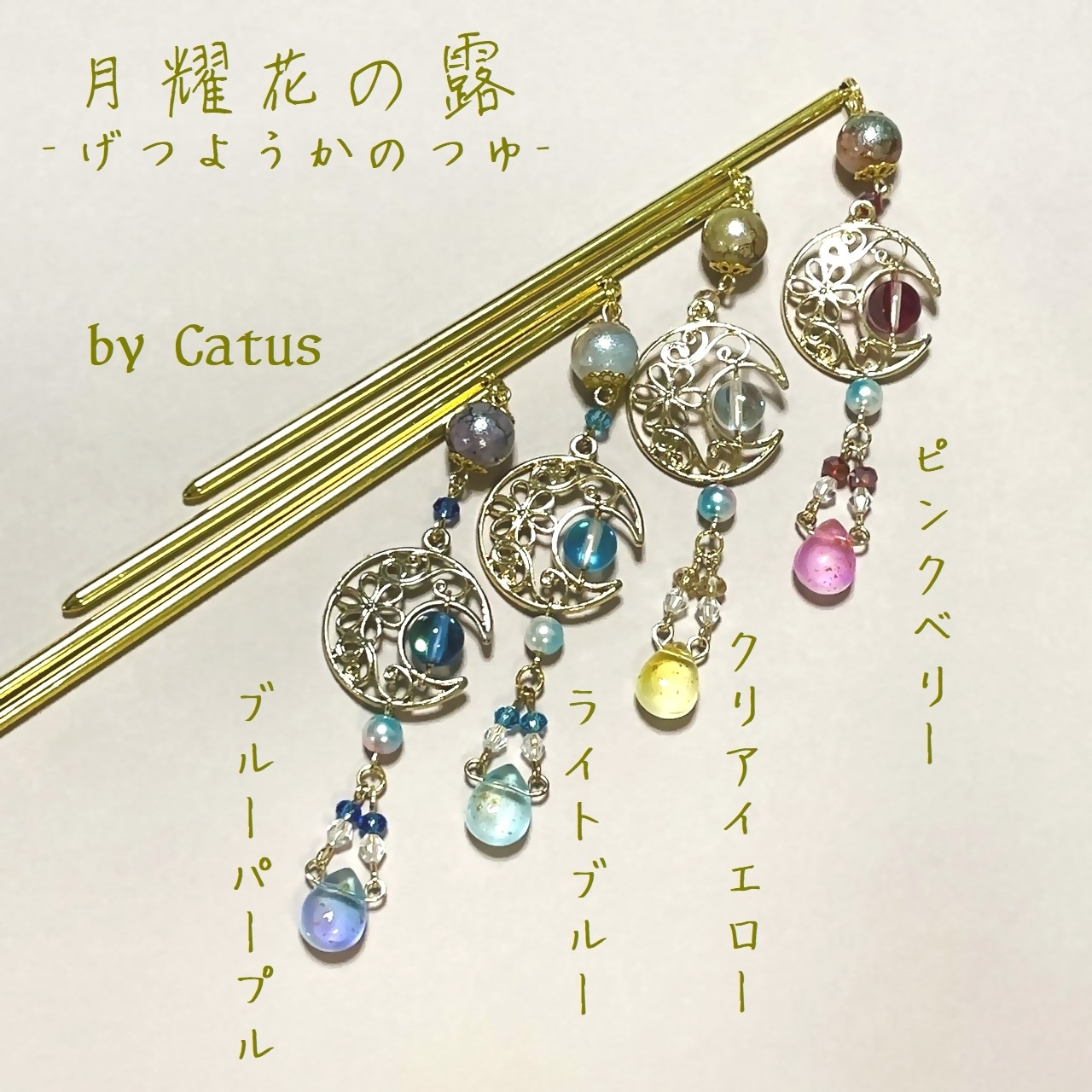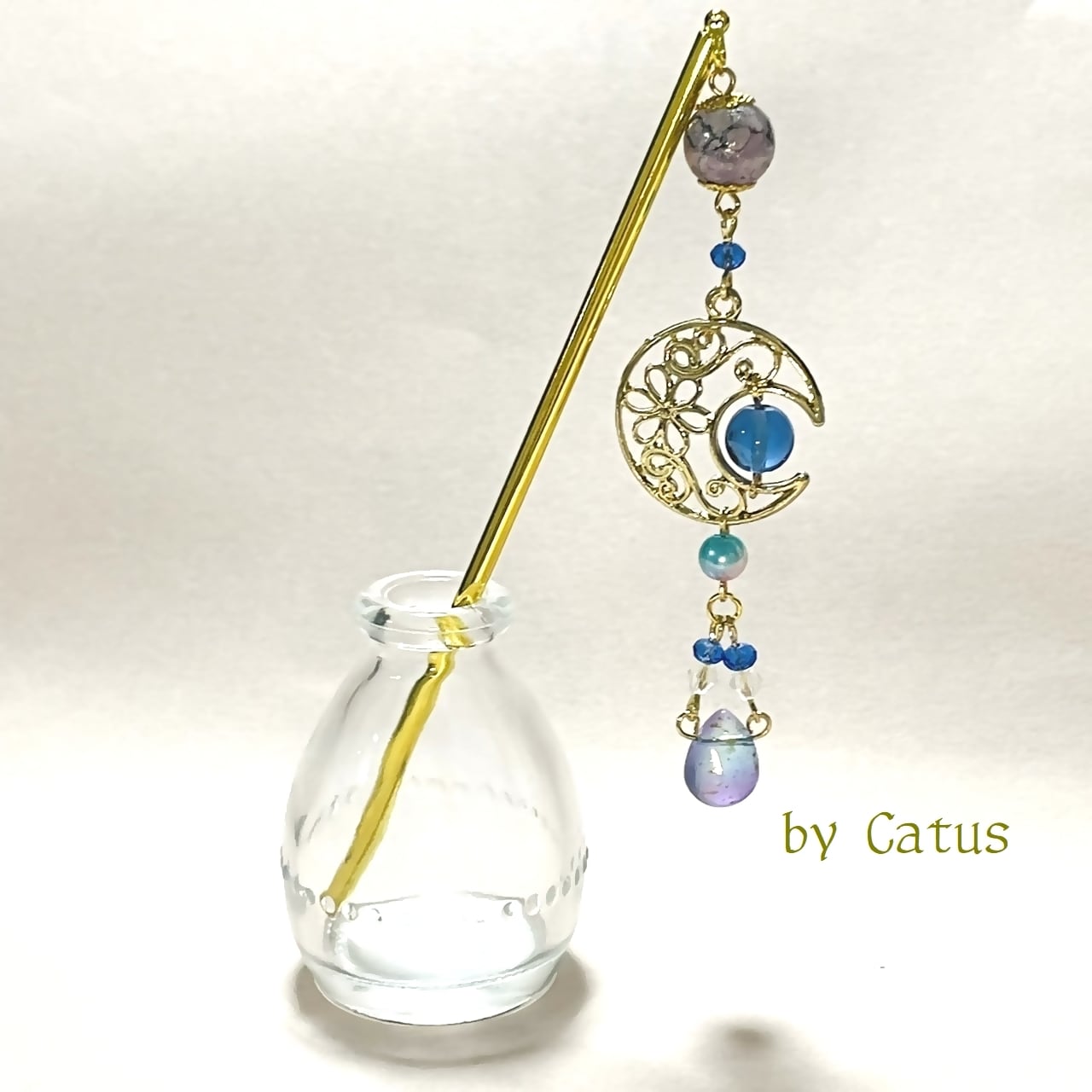 三日月の中に、ルナフラッシュというオーロラ加工を施したガラスビーズを入れて、月の光を表現いたしました。